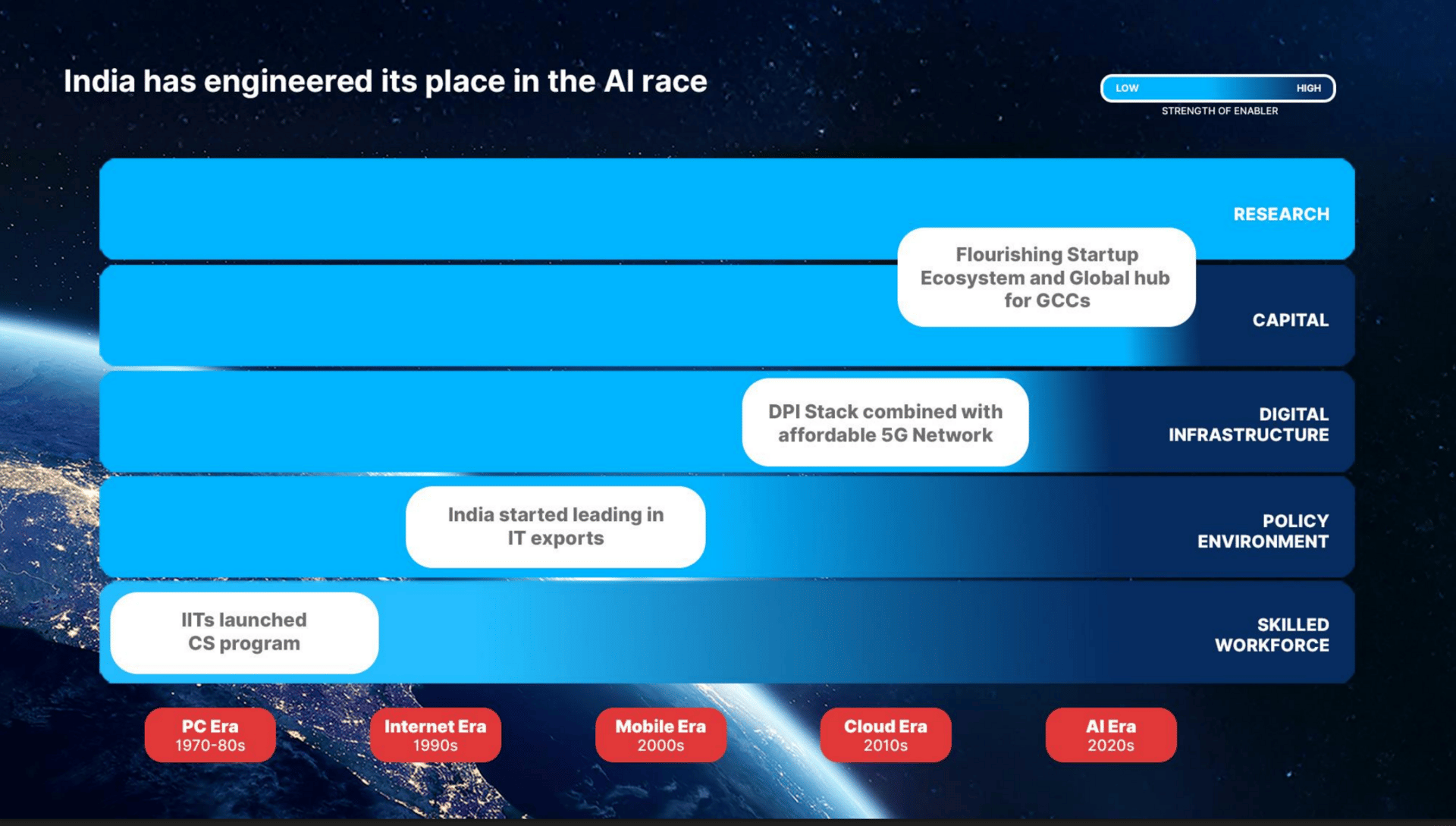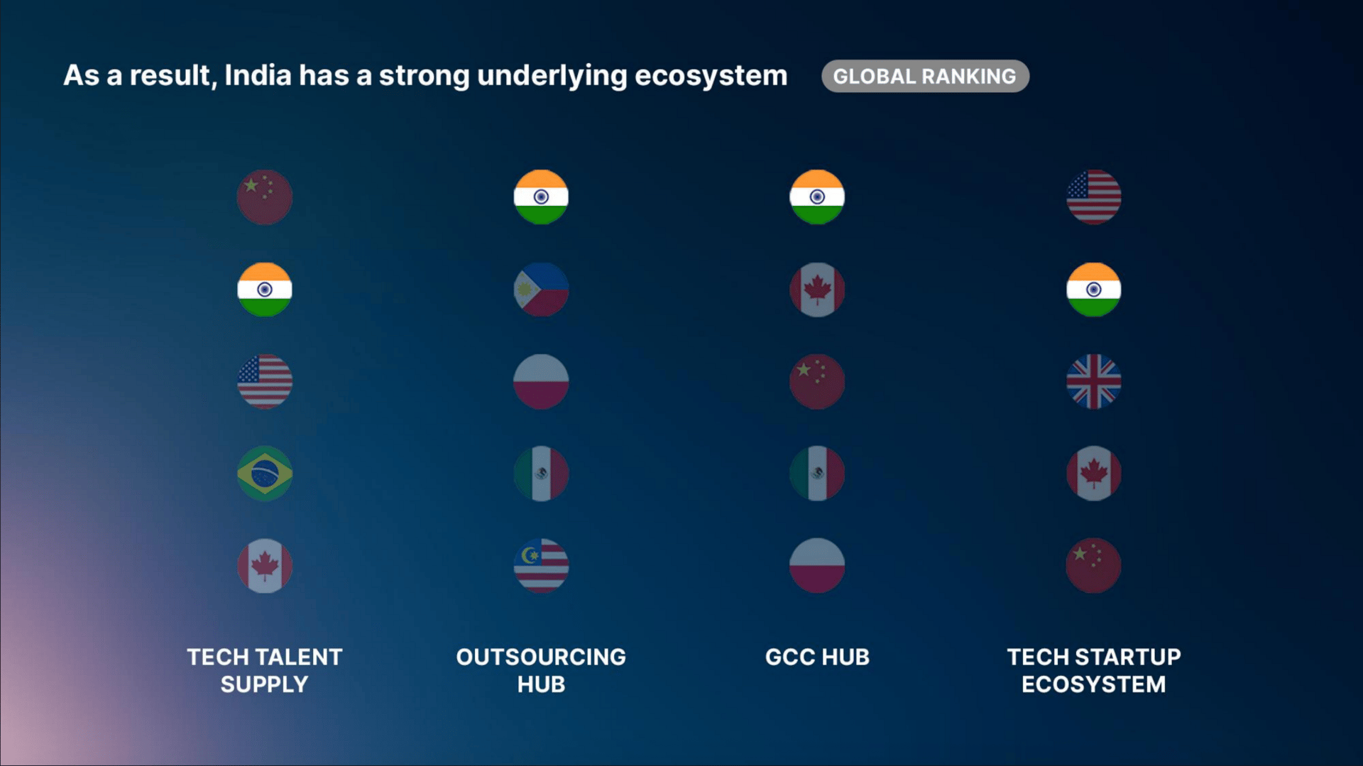 Availability and quality of talent is the basis for scaling technology development. India has the second largest tech pool in the world, and the largest English speaking one. A crucial advantage for the next phase of technological development and where deep understanding of business processes is advantageous.
