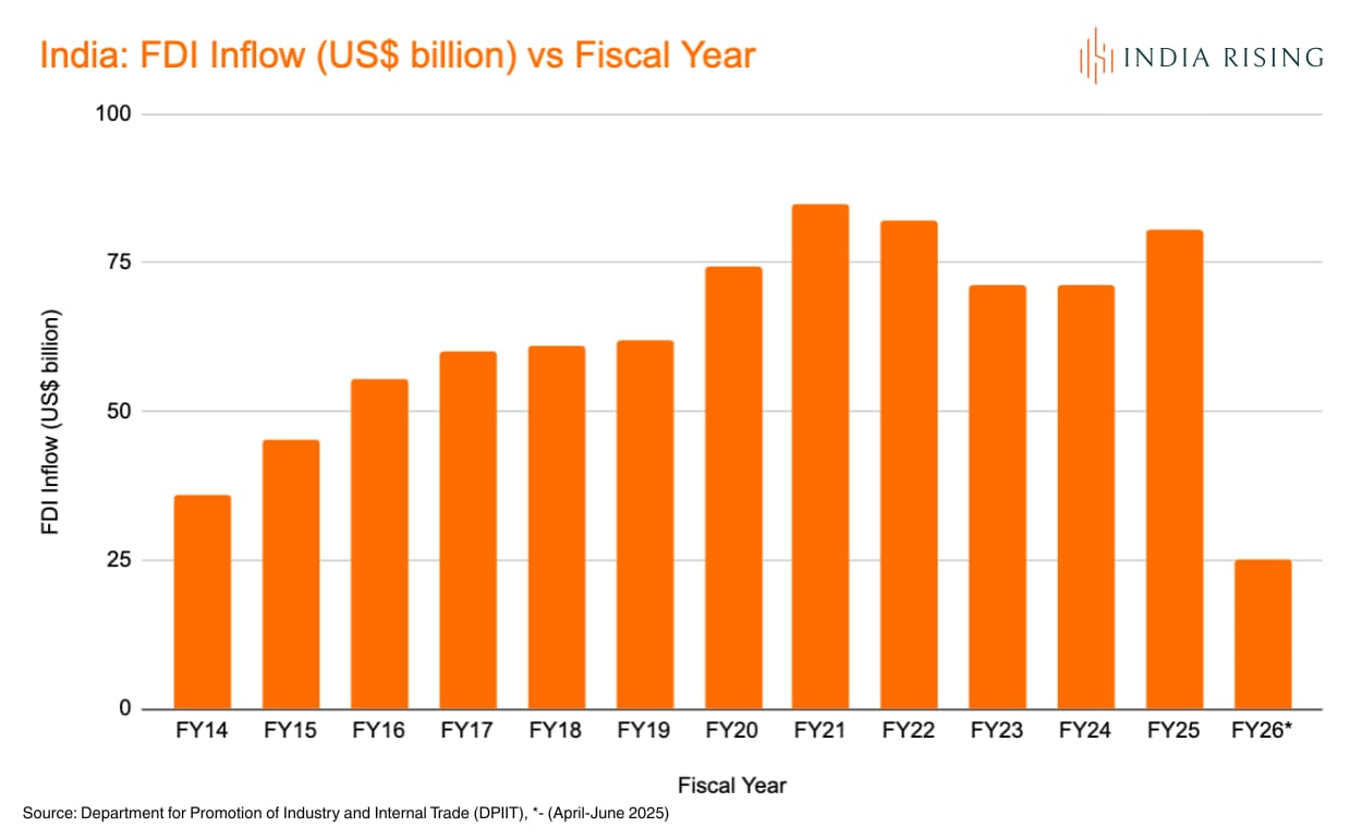 FDI grew by 16% year over year in the April to September quarter and reached USD 50.4 billion. While some commitments will be spread over several years, officials expect annual FDI inflows to be over USD 100 billion for the first time ever this fiscal year.