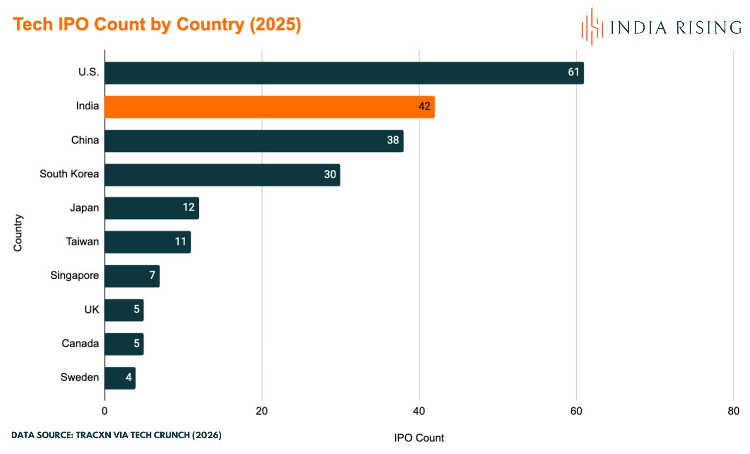 The importance of India’s Tech sector is indicated by the following chart, showing that India has the second largest cohort of Tech IPOs globally: