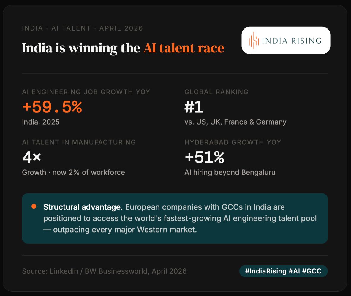 Three key signals matter for European businesses here. Companies with GCCs in India are sitting on a structural AI talent advantage, with 59.5% year-over-year growth in AI engineering roles outpacing both the US and Europe. India's data center buildout is increasingly relevant for European enterprises designing Asia-Pacific data architectures, and the ten Indian AI startups cohort to Paris should be tracked by European VCs and corporations. Depending on where you seat on the table, margin pressure for Indian IT vendors might give European buyers more renegotiation leverage moving forward.