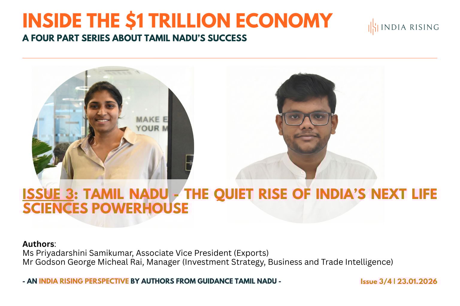 The authors of today’s issue of the India Rising Perspective - Inside the $1 Trillion Economy, are Ms Priyadarshini Samikumar, Associate Vice President (Exports) and Mr Godson George Micheal Rai, Manager (Investment Strategy, Business and Trade Intelligence).
