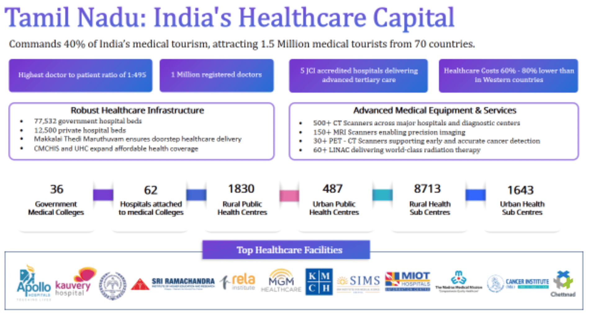 Tamil Nadu commands 40% of India's medical tourism, attracting 1.5 million patients annually from over 70 countries seeking treatment that combines world-class outcomes with accessible costs. Its doctor-to-patient ratio of 1:495 is the nation's highest, supported by one million registered medical professionals. The state maintains 77,532 government hospital beds and 12,500 private beds. Five JCI-accredited hospitals deliver tertiary care at costs 60–80% below Western equivalents, not through compromise, but through scale and efficiency. A cardiac bypass that costs $150,000 in the United States can be performed with equivalent outcomes for a fraction of that amount in Chennai, transforming the city into what many now call the 'Health Capital of Asia.'